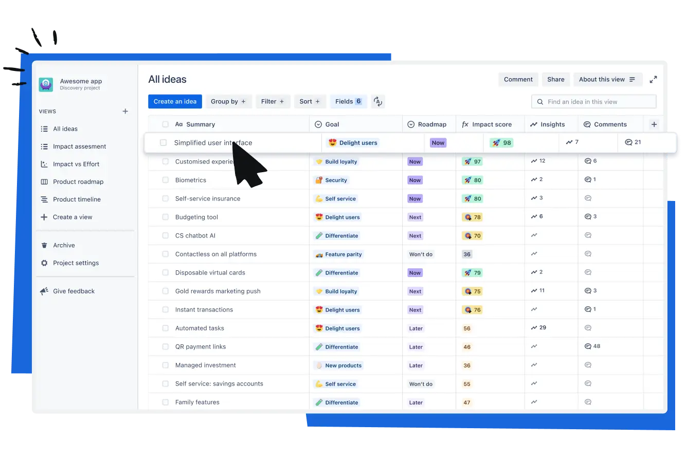Capture ideas in a discovery board before committing to delivery. Evaluate impact, effort, and strategic alignment before moving to Jira execution.