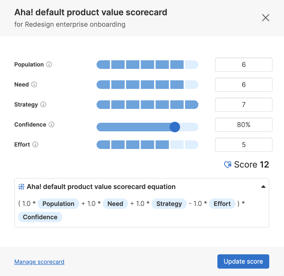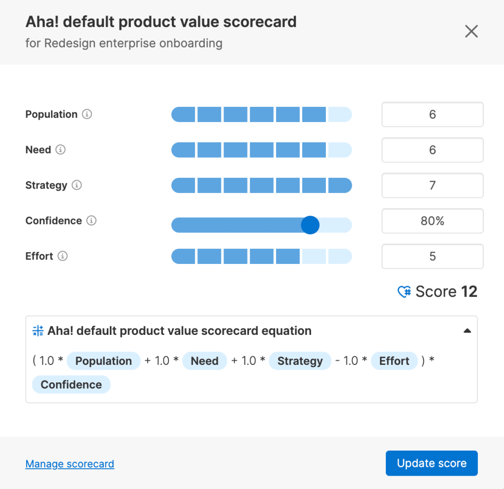 Prioritization should be transparent, data-informed, and repeatable. Aha enables structured scoring so initiatives can be evaluated consistently before funding decisions are made.